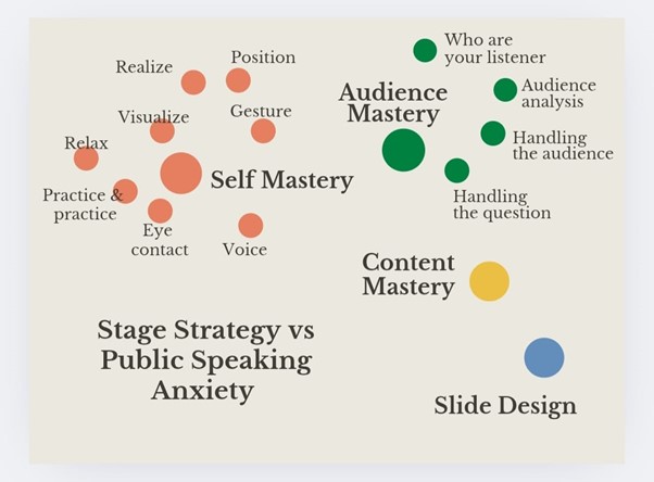 Kegiatan diawali dengan relaksasi, dan mencoret bebas melalui simbol dan warna sebagai media pengungkapan diri. Seringkali kita berpikir tidak bisa, gugup, cemas, takut salah, bingung, blank, atau pikiran-pikiran lainnya yang membuat kita kesulitan ketika harus berbicara di depan umum. Mahasiswa dibantu mengenali narasi diri yang menjadi hambatannya dalam berkomunikasi.