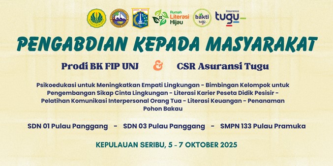 Program Studi S1 dan S2 Bimbingan dan Konseling, Fakultas Ilmu Pendidikan Universitas Negeri Jakarta (UNJ), melaksanakan kegiatan Pengabdian Kepada Masyarakat (PKM) di Kepulauan Seribu pada 5–7 Oktober 2025. Kegiatan ini merupakan kolaborasi antara Prodi BK FIP UNJ, Tugu Insurance, Prestasi Junior Indonesia (PJI), dan Rumah Literasi Hijau, dengan dukungan dari Kelurahan Pulau Panggang, Suku Dinas Kepulauan Seribu, Pemerintah Provinsi DKI Jakarta, serta Taman Nasional Laut Kepulauan Seribu.